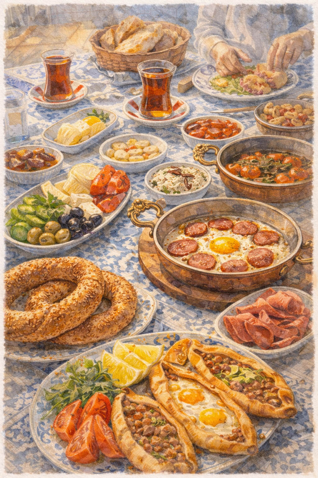 - Turkish Breakfast – Cheeses, olives, eggs, honey, clotted cream, and freshly baked bread.
